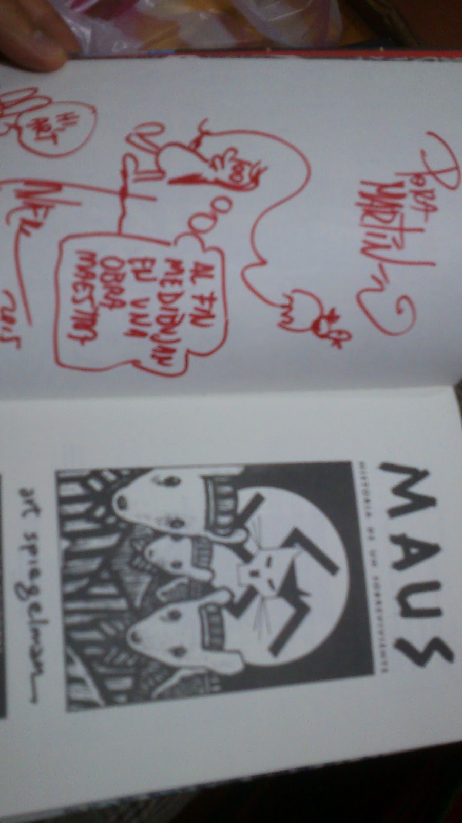 OK, Ayer fui a ver y escuchar a Kevin Johansen, Liniers y The Nada. Me entero que Liniers se va de la argentina, es así, va a hacer terrorismo en EEUU o a trabajar en Disney (que hoy por hoy es casi lo mismo). Tengo que decirlo, siempre me acuerdo de las tiras de "Bonjour" y lo que me impacto el 1 o 2 libro de "Macanudo". Me lo mostró un amigo y me dice "a mi me matan estos libritos". Habia una tira que salia Pacman y el Fantasmita, sentados en una plaza dándole de comer a las palomas y el efecto que tuvo en mi persona fue increíble. Escribo esto y me rio. En fin, hace un tiempo atrás, tuve la suerte que Art Spiergelman no me firmara un ejemplar de Mauss, y me lo cruce a Liniers y no me dejo que me volviera a mi casa con las manos vacías. Puedo seguir, pero simplemente diré "Buen viaje"!!!!